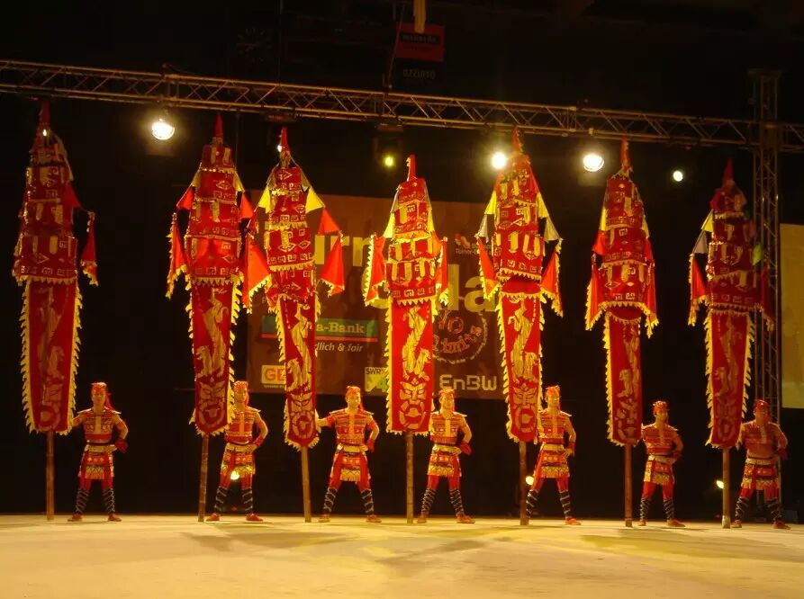 中幡这种“头重脚轻”杂技造型的成功,除了因为演员的头有足够的力量之外,更重要的是演员掌握好了平衡。要使物体保持平衡,必须叫中幡杆子的重心沿力的作用线落到演员的头顶。这样,顶中幡杆子的演员头部向上用的力和中幡的重力,恰好在一条直线上,大小相等,方向相反,合力为零,使两个力处于平衡状态,所以中幡杆子越高,观众会越为演员们提心吊胆。其实,杆子越高,演员反而容易做到安然无恙,这又是为啥呢?让我们一块儿做个实验吧:假如我们用手指顶根铅笔,铅笔很难被顶立起来;假如用手指顶立个鸡毛掸子时,鸡毛掸子却很容易地被顶起来。这是由于鸡毛掸子杆儿比较长,当它要倒时,也就是重心偏离开时,人有足够的时间靠摆动手指来调整它的重心。由此可知,只要顶中幡的演员头部有足够的力量,杆子越高,就越容易掌握力的平衡。