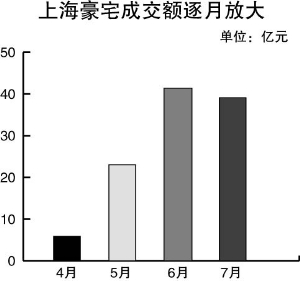 易居中国分析师薛建雄介绍,从二季度上海楼市明显回暖至今,豪宅成交是月月增长,如4月成交单价4万元/平方米以上的豪宅涉及14个楼盘的30套房源、总成交金额5.85亿元,到7月已升至23个楼盘的307套房源、总成交金额39.09亿元。