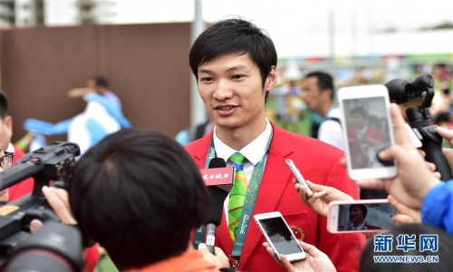 8月3日,雷声在里约奥运村中国代表团升旗仪式前接受媒体采访。