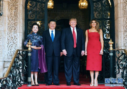 下午5时许,习近平和夫人彭丽媛抵达海湖庄园,特朗普和夫人梅拉尼娅在停车处热情迎接。两国元首夫妇合影留念,亲切交谈。两国元首夫妇共同欣赏了特朗普外孙女和外孙演唱中文歌曲《茉莉花》并背诵《三字经》和唐诗。