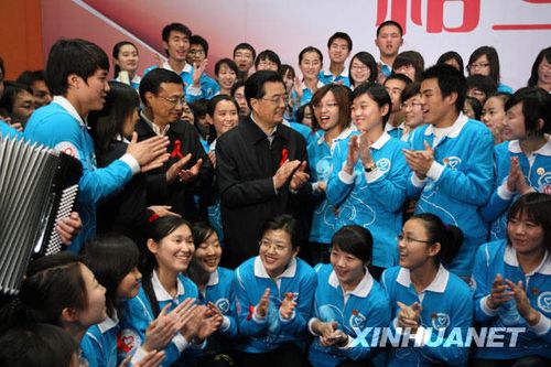 随后,胡锦涛又来到主题互动区。在防治艾滋病志愿者招募站,许多年轻人正在领取志愿者报名登记表。总书记走过去,向工作人员了解志愿者招募情况。北京中医药大学博士生刘丹彤去年参加了北京奥运会志愿服务,今天又申请成为防治艾滋病志愿者的一员。她对总书记说,做一名志愿者很光荣,我是学医的,愿意为防治艾滋病尽一份力。总书记笑着说:“你有无私奉献精神,有从事志愿服务经验,还有医学专业知识,相信你一定能成为一名优秀的防治艾滋病志愿者。”