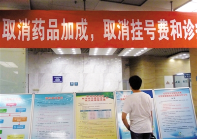 7月4日,北京友谊医院内,患者观看宣传板上有关医药分开的图表及说明。资料图片