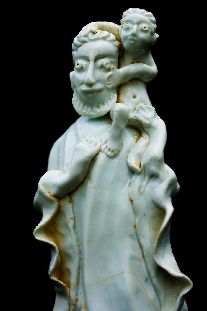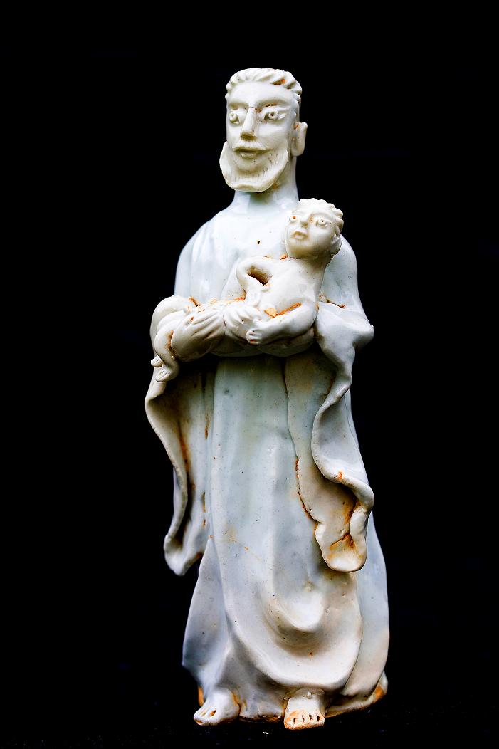 据博物馆馆长讲述,20世纪80年代早期某夏秋交替的一天,该博物馆接到一个电话让馆长去看一批外国洋人的瓷塑像,此人也讲不清是些什么东西,只说是全部是穿长袍打赤脚的外国人。其中有抱小孩,有的拄拐棍,有长翅膀的,还有双手合十、双手抱头、手上捧鸟的等等(图2)(图3)。它们全部是在施工时从一个废弃的古代教堂下面挖出来的。馆长当时看过后认为,这样的造像在国内不可能有人买,因此就不存在有新仿;也不像是用于出口的现代艺术品。馆长认为是老器,将其带回博物馆搁置在一角,从此再也没打开过,直至这次鉴定才使其重见天日。