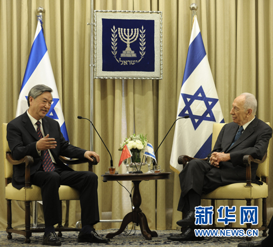 5月27日,正在以色列访问的新华社社长李从军在耶路撒冷会见以色列总统佩雷斯。 新华社记者 尹栋逊 摄