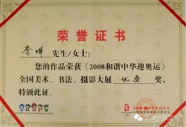 《2008》年奥组委文化活动部授予水晶奖杯和荣誉证书