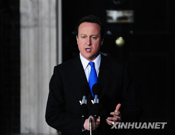 资料图片:2010年5月11日,在英国伦敦,保守党领袖卡梅伦在唐宁街10号首相官邸前发表讲话。卡梅伦当晚接任首相职务,他应女王伊丽莎白二世的要求着手组建新一届政府。新华社记者曾毅摄