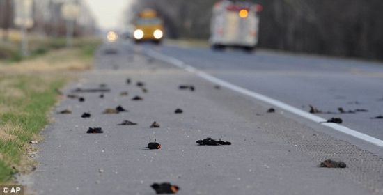 报道称,在2011年新年夜3000多只燕八哥在阿肯色州小镇比比上空坠亡,专家认为这些飞鸟坠亡可能与新年焰火有关。距阿肯色州579公里的路易斯安那州3日也发生了500只飞鸟坠亡事件。此外,一名肯塔基州女子对当地电视台称,她3日在院子里发现了数十只鸟的尸体。在该州西北部距鸟坠亡事发地点160公里的地方,至少有8.3万条死鱼和垂死的河鱼被冲上岸,而据专家估测,死鱼的数量可能达到10万条。另外,马里兰州环境部门称,该州切萨皮克湾发生了数万条小鱼死亡的事件。环境部门工作人员称,小鱼死亡的原因是水过冷。