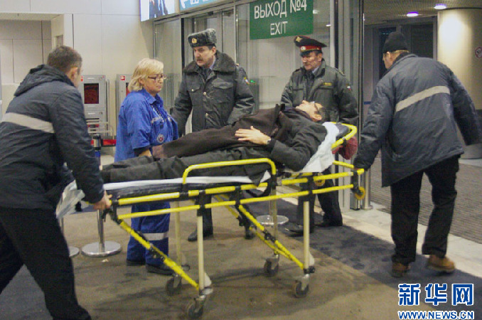 1月24日,在俄罗斯首都莫斯科多莫杰多沃机场,救护人员转移一名爆炸事件中的伤者。新华社/法新