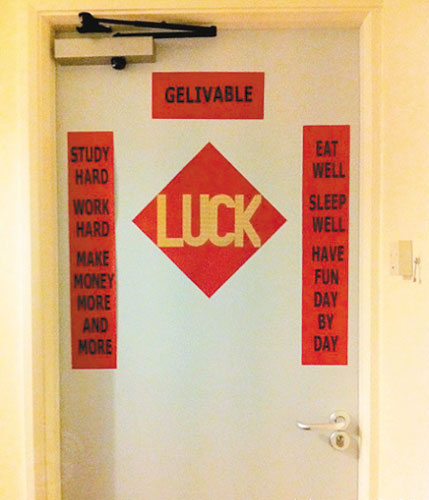 这副春联上下联各有9个英文单词、4个词组,按中国春联的格式竖排。门右侧的上联是“Eat Well Sleep Well Have Fun Day by Day”(意思是“吃得不错、睡得不错、天天都开心”),门左侧的下联是“Study Hard Work Hard Make Money More and More”(意思是“努力学习、努力工作、钱越挣越多”)。门上方的横批则是去年由中国网民创造的新英文单词“Gelivable”(意思是“给力”)。门中间还贴着一张菱形的大红纸,上面印着金色大字“LUCK”(意思是“好运”)。