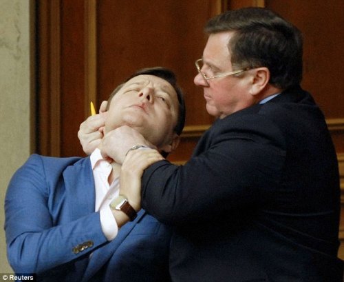 据外媒报道,在5月18日举行的一次议会会议期间,乌克兰议会副议长亚当·马泰恩尤科(Adam Martynyuk)掐住议员奥列格·利亚申科(Oleg Lyashko)的脖子,并将他重重地摔在地上。