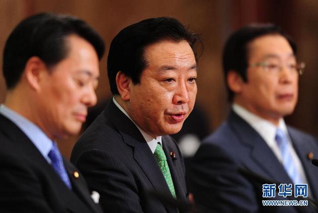 8月27日,在东京日本记者俱乐部,野田佳彦(中)在记者会上阐述观点。当日,角逐日本民主党代表(党首)的5名候选人前外相前原诚司、经济产业大臣海江田万里、前国土交通大臣马渊澄夫、财务大臣野田佳彦和农林水产大臣鹿野道彦在日本记者俱乐部举行联合记者会,阐述各自的政策主张。新华社记者 季春鹏摄
