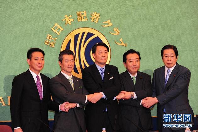 8月27日,在东京日本记者俱乐部,前原诚司、马渊澄夫、海江田万里、野田佳彦和鹿野道彦(从左至右)在记者会前握手。当日,角逐日本民主党代表(党首)的5名候选人前外相前原诚司、经济产业大臣海江田万里、前国土交通大臣马渊澄夫、财务大臣野田佳彦和农林水产大臣鹿野道彦在日本记者俱乐部举行联合记者会,阐述各自的政策主张。新华社记者 季春鹏摄