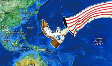 美国“重返亚太”以来,加强在澳大利亚军力部署,图为外媒绘制的美国长腿跨越太平洋,一脚踩到澳大利亚西北部,进而威慑东南亚。(资料图)