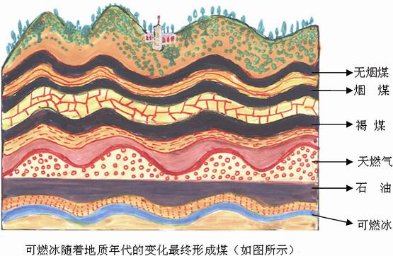 大地深处的石油会不断挥发、挥发、再挥发,为土壤赋予生生不息的功能,为整个生态系统提供源源不断的基础营养。只是,在地幔不安分的涌动中,长时间的地质作用使许多烃类由简单化合成复杂的有机物,或者形成碳链较长的烃类,呈现出固态,消失了挥发功能。所以,一部分可燃冰或石油没有参与生态系统的碳循环中,而是化合成呈固态的烃类和极少量的其它有机物。在陆地升抬的过程中,可燃冰首先形成油气田,积聚在岩石圈中的背斜构造中。经过长久的渗漏与地质变迁,油气田中的油气渐渐减少,长链分子越来越多,石油即由透明渐变浅黄、深黄、浅棕、深棕乃至黑色,直至成为沥青。沥青主要含量就是固液态的烃分子。这些烃中的氢元素性质活泼易置换,碰到氧、硫、硅等元素,很轻易就离开它原有位置,而与其它元素结合形成氢气、硫化氢、水等。粘稠的沥青在此过程中逐渐被石化、碳化,就形成煤。煤炭种类由低级到高级的分类,就是体现的沥青最后未挥发尽的一个残余过程。