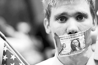 抗议者用一美元纸钞将嘴巴封住。
