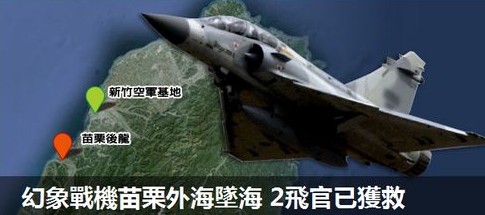 台湾军方证实,一架“幻影”2000战机上午10时18分在新竹西方外海与基地失去联系。搜救人员在11时32分救起弹射跳伞逃生的两名飞行员。