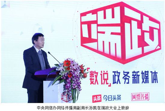 在第二届乌镇世界互联网大会闭幕不久、2016年新春来临之际,由中央网信办新闻传播局、移动局提供指导,今日头条和《网络传播》杂志共同主办、首都互联网协会大力支持的“端.政——数说政务新媒体”大会隆重召开,这既是贯彻落实乌镇世界互联网大会所达共识的坚实一步,又为2016“互联网创新年”起了“好头”。受中央网信办鲁炜主任和徐麟副主任的委托,我对“今日头条”积极搭建政务信息传播平台表示诚挚感谢,对大会成功举办表示由衷祝贺,对全国政务新媒体同仁的辛勤工作和卓越表现表示高度肯定和表扬。