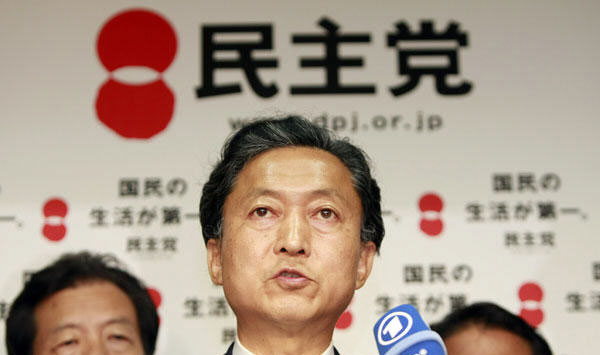 8月31日,在日本东京民主党总部,民主党党首鸠山由纪夫(前)在结束与党内高层举行的会议后,接受媒体访问。新华社记者任正来摄