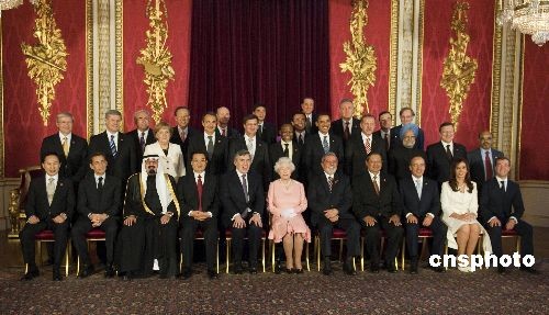 当地时间4月1日下午,英国女王伊丽莎白二世和丈夫菲利普亲王在白金汉宫举行招待会,款待参加G20峰会的领导人。图为女王和嘉宾合影,图中一排左四为中国国家主席胡锦涛。 中新社发 丹尼尔 摄