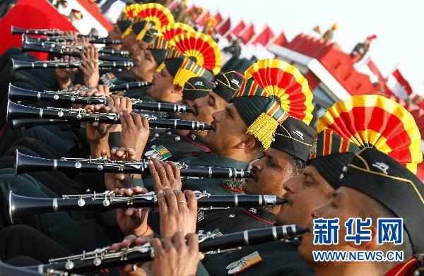 2011年1月15日印度庆祝陆军建军63周年1月15日,印度士兵在首都新德里举行的陆军建军63周年庆典仪式上吹奏乐器。 新华社\路透社