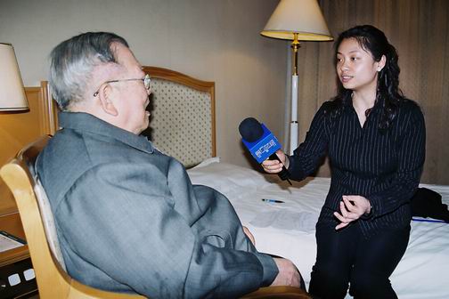 第一财经日报记者韩英珂 (右)在北大消费论会议上采访中国专家学者协会副会长、