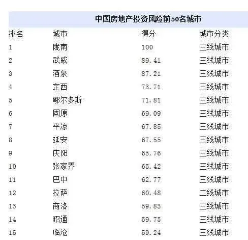 在排行榜中,陇南、武威、酒泉、定西、鄂尔多斯、固原、平凉、延安、庆阳、 张家界位列城市房地产发展风险前十位;上海、北京、深圳、广州、重庆、天津、成都、沈阳、苏州、南京位列城市房地产发展前景前十位。