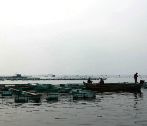 “鱼为衣食,海为田园”,水产品可代粮、节粮、促粮,保障粮食安全。山东三面环海,海岸线约占全国的1/6,具有建设“海上粮仓”的先天之利。今年1 月,山东出台政策推进建设“海上粮仓”,到2020年,力争全省水产品总产量达到1000万吨,蛋白质当量相当于粮食400亿斤,“蓝色半岛”开启海洋经 济新模式。图为荣成市的“海上牧场”。 |